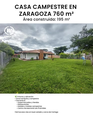 Esta casa campestre en venta se encuentra en un condominio campestre ubicado en Zaragoza, una zona estratégica cerca a Cartago, reconocida por su ambiente tranquilo y su fácil acceso vehicular.